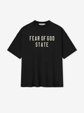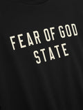 เสื้อยืดยุค 90 ผลิตจากผ้าเจอร์ซีย์คอตตอน 100% น้ำหนักปานกลาง เสื้อยืดคอกลมทรงหลวมสไตล์ยุค 90 มาพร้อมดีไซน์ไหล่ตก ด้านหน้าสกรีนโลโก้ "Fear of God State" และป้าย Fear of God Essentials แบบเคลือบยางที่คอเสื้อด้านหลัง